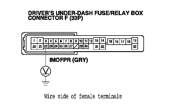 25. Turn the ignition switch to ON (II), or press the engine start/stop button to select the ON mode, and measure the voltage between driver's under-dash fuse/relay box connector F (33P) terminal No. 22 and body ground within 2 seconds.