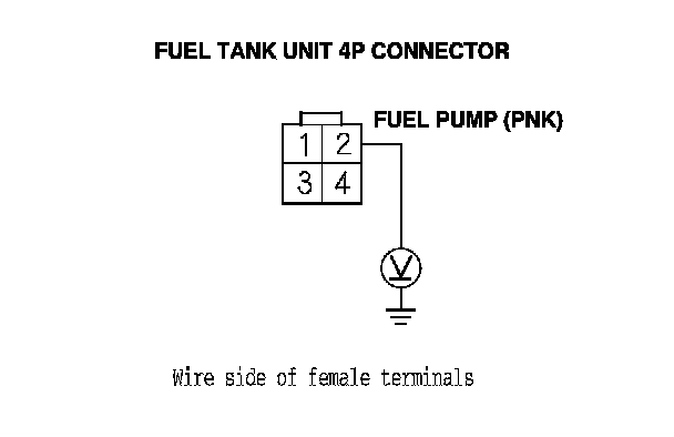 34. Turn the ignition switch to ON (II), or press the engine start/stop button to select the ON mode, and measure the voltage between fuel tank unit 4P connector terminal No. 2 and body ground.