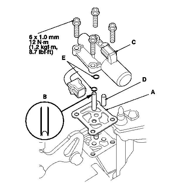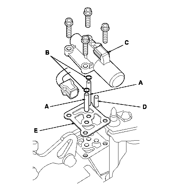 10. Remove A/T clutch pressure control solenoid valve C, the ATF joint pipes (A), the O-rings (B), the ATF pipe (D), and the gasket (E).