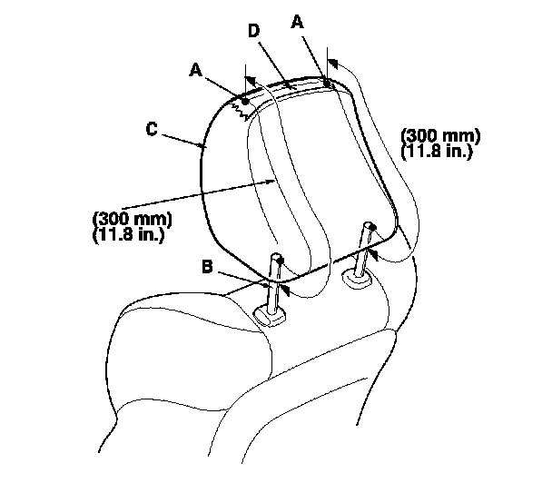 3. Make marks (A) on both sides at 300 mm (11.8 in.) upward from the roots of the head restraint frame (B) along the back of the head restraint (C) surface. Use the center point (D) between the two marks for the measurements in step 4.