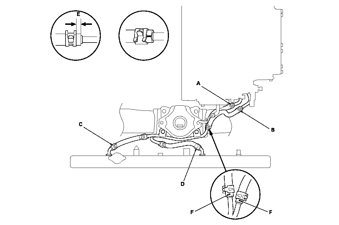 1. Install the ATF cooler hoses over the ATF cooler lines with the clips at the appropriate points in reference to the following list. Align the paint marks (F) to the driver's side.