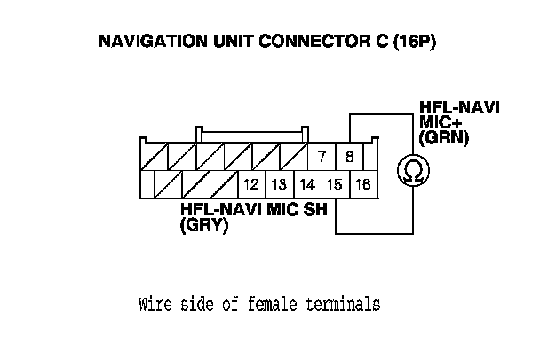 13. Check for continuity between navigation unit connector C (16P) terminals No. 8 and No. 16.