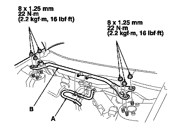 2. Disconnect the brake booster vacuum hose (A) from the strut brace (B).