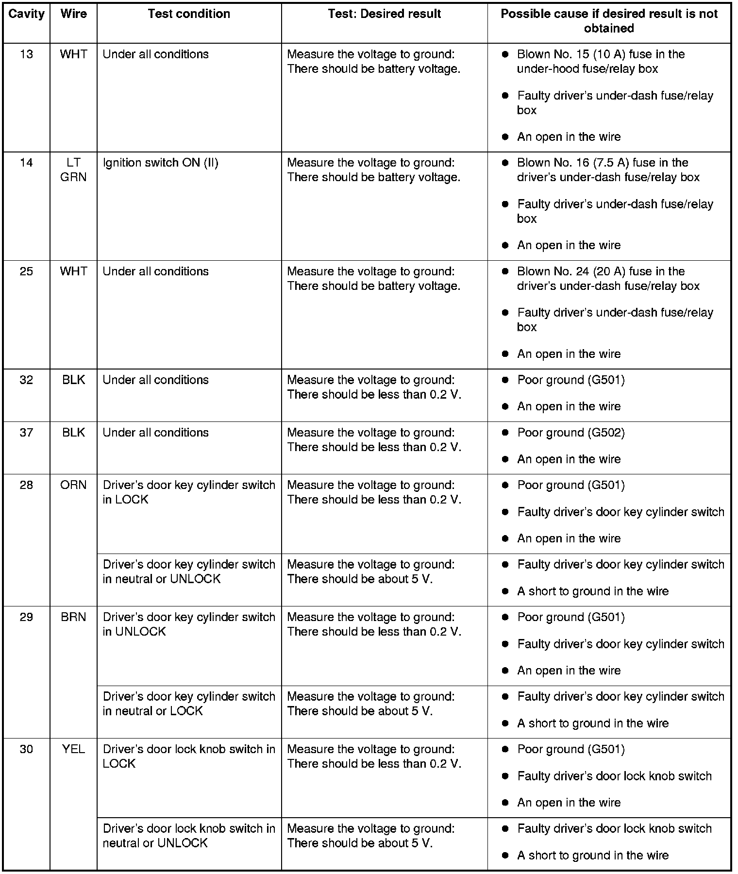 6. Reconnect the connectors to the driver's under-dash fuse/relay box, and do these input tests at the following connectors.