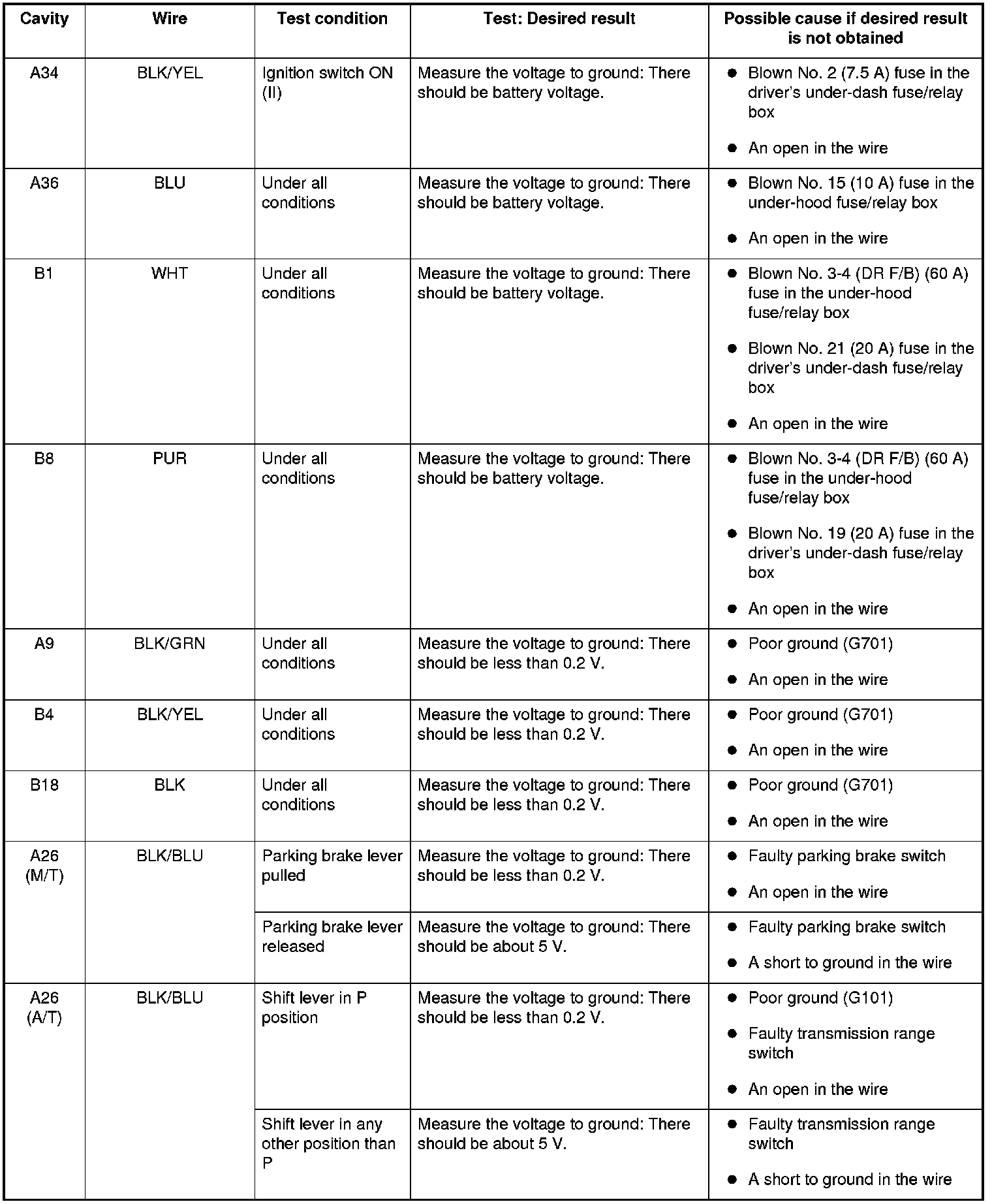 6. Turn the ignition switch to LOCK (0), then disconnect the connectors from the power seat control unit, and do these input tests at the following connectors.