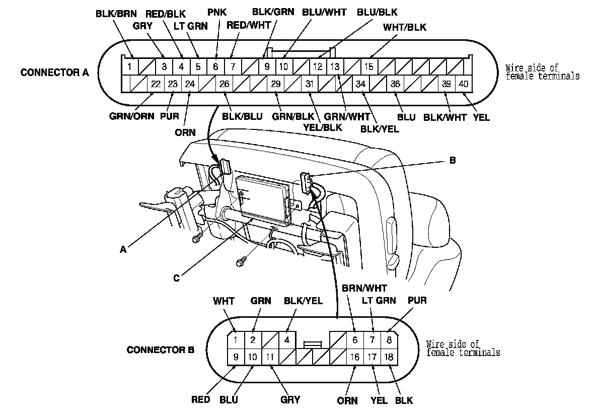 3. Disconnect the 40P connector (A) and 18P connector (B) from the power seat control unit (C).