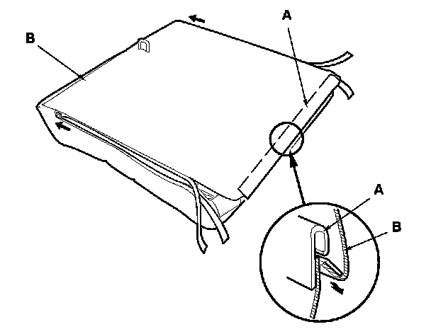 6. Release the lower hook strip (A), and unzip the seat-back cover (B).
