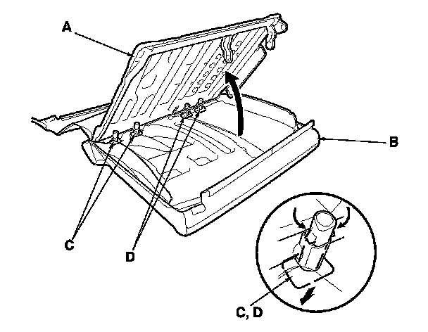 7. Pull out the seat-back frame (A) from the seat-back cover/pad (B), then remove the head restraint guides (C) and the center head restraint guides (D) while pinching the end of the guides.