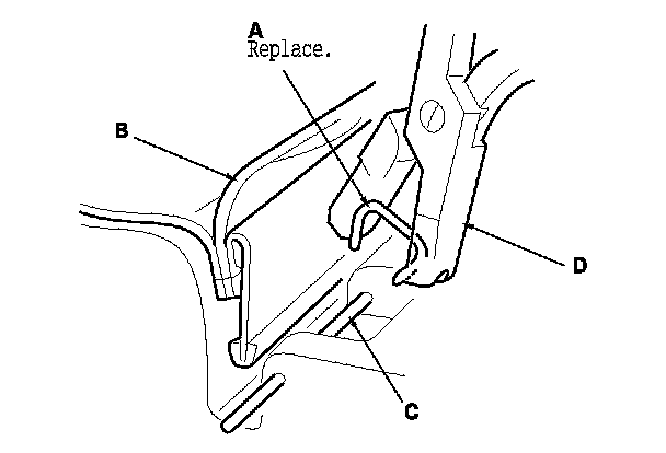 - Replace all of the upholstery rings (A) fastening the seat-back cover (B) to the pad wires (C) with new ones using commercially available upholstery ring pliers (D).