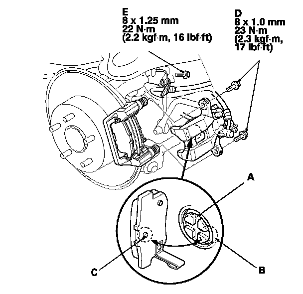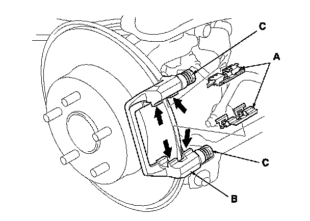 Verify that the caliper pins (C) move in and out smoothly. Clean and lube if needed.