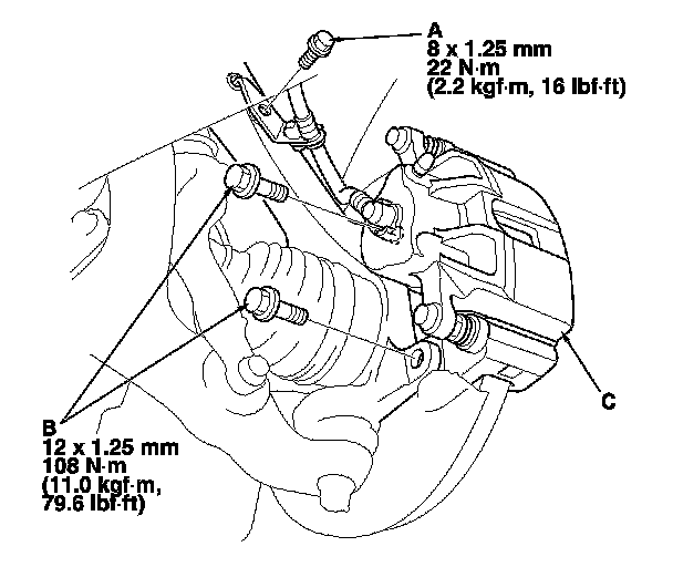 4. Remove the brake caliper bracket mounting bolts (B), then remove the caliper assembly (C) from the knuckle. To prevent damage to the caliper assembly or brake hose, use a short piece of wire to hang the caliper assembly from the undercarriage. Do not twist the brake hose excessively.