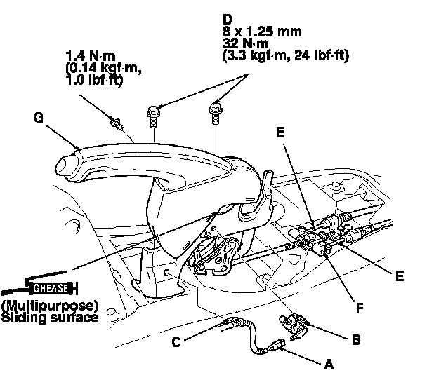 5. Disconnect the parking brake cables (E) from the equalizer (F), then remove the parking brake lever (G).