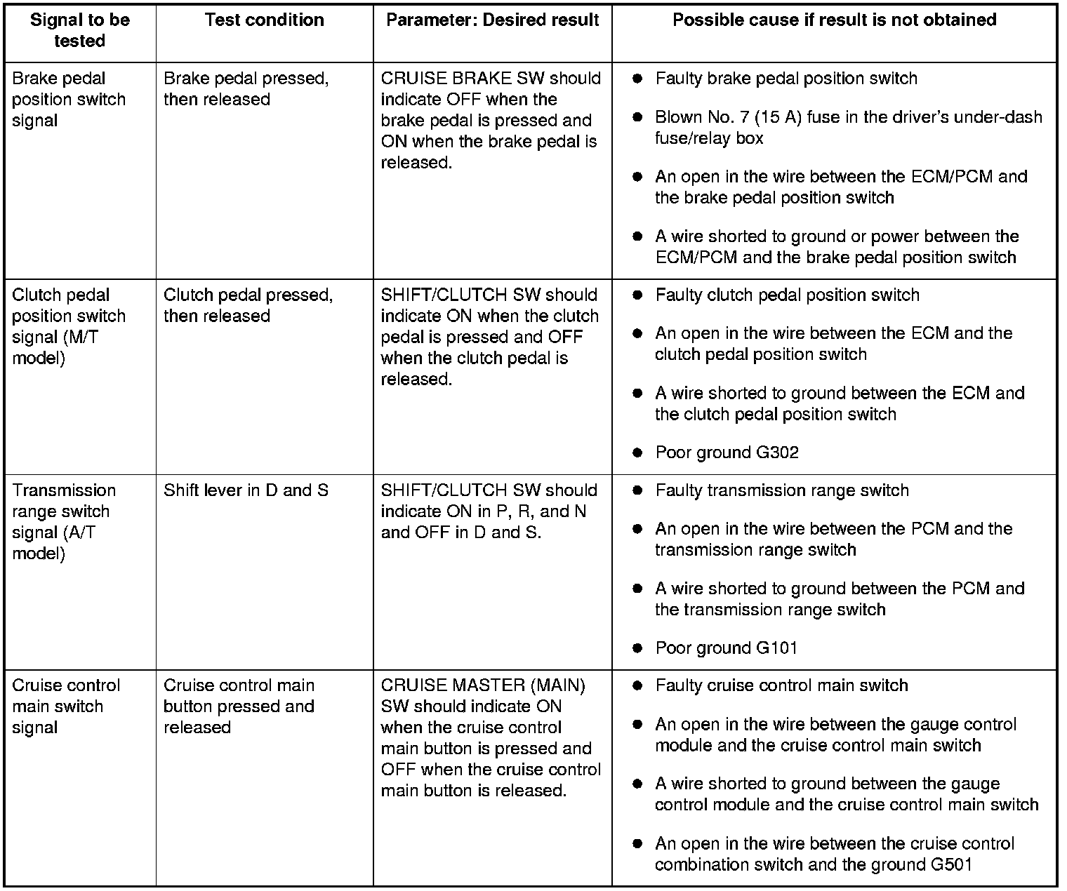 NOTE: Intermittent failures are often caused by loose circuit connections. While monitoring cruise control inputs, flex the circuit wires, and note if any of the test results change.
