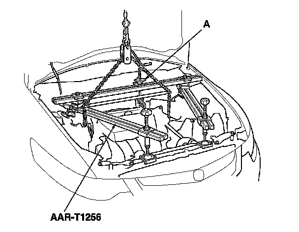 4. Install the engine support hanger (AAR-T1256), then attach the hook to the slotted hole in the engine hanger adapter. Tighten the wing nut (A) by hand to lift and support the engine/transmission.