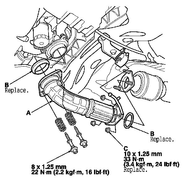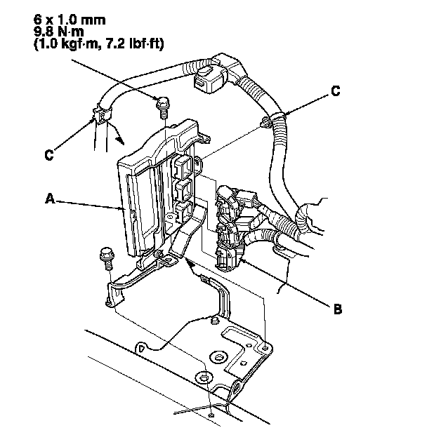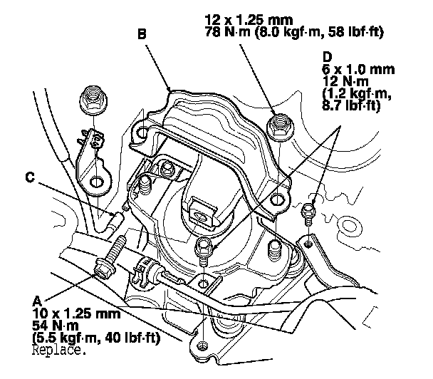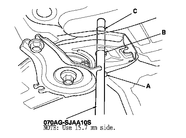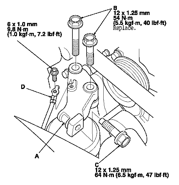 9. Install the side engine mount bracket (A), and tighten the new bolts (B), then tighten the bolt (C).