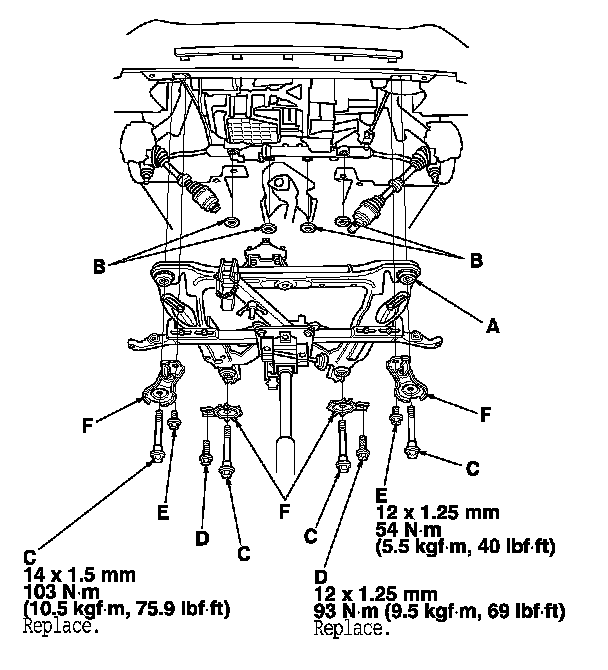13. Loosely install the new front subframe mounting bolts (C), the rear stiffener mounting bolts (D), the front stiffener mounting bolts (E), and the stiffeners (F).