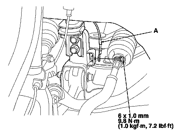 24. '09 model: Install the ground cable (A) to the front subframe.