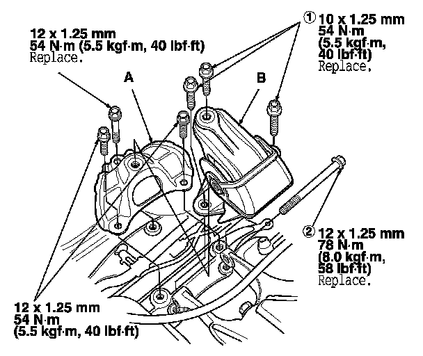 32. A/T model: Install the rear engine mount upper bracket (A). Install the rear engine mount (B), then tighten the new rear engine mount mounting bolts in the numbered sequence shown.