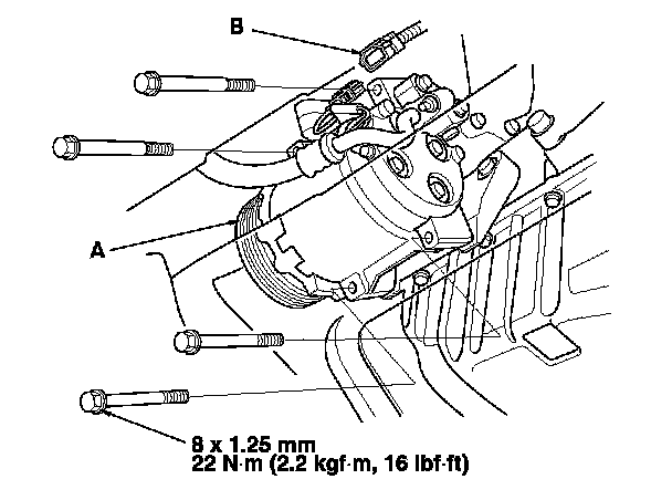 42. Install the A/C compressor (A), then connect the A/C compressor clutch connector (B).