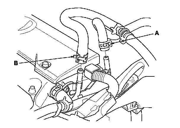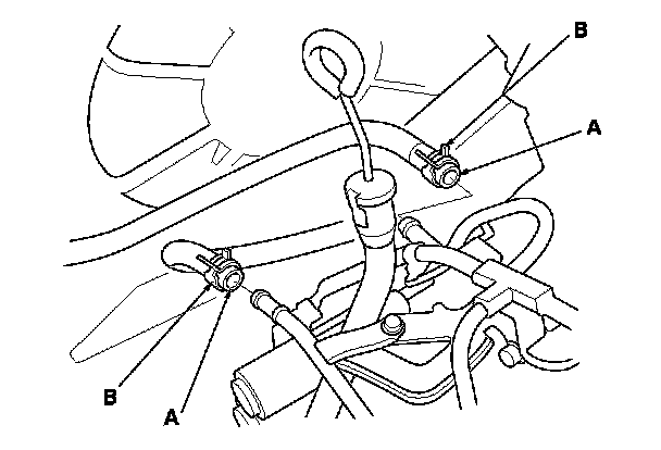 59. Install the evaporative emission (EVAP) canister hose (A) and the brake booster vacuum hose (B).