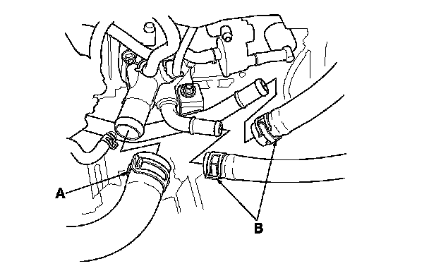 48. Connect the upper radiator hose (A) and the heater hoses (B).