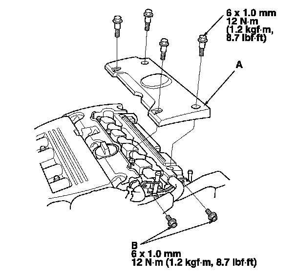 57. Install the ignition coil cover (A) and the brake booster vacuum line mounting bolts (B).