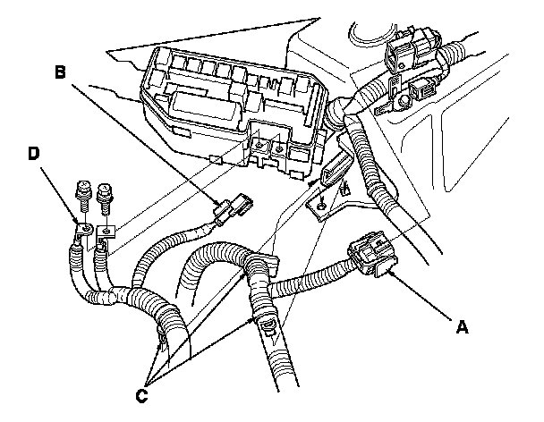 63. Install the battery cables (D) to the under-hood fuse/relay box.