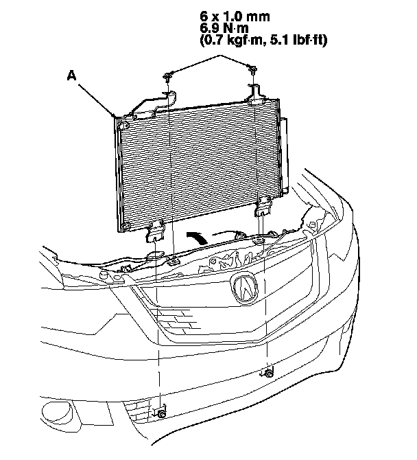 8. Remove the bolts, then remove the A/C condenser (A) by lifting it up. Be careful not to damage the radiator or A/C condenser fins when removing the A/C condenser.