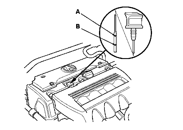 3. Remove the dipstick, and check the engine oil level. It should be between the upper mark (A) and the lower mark (B).