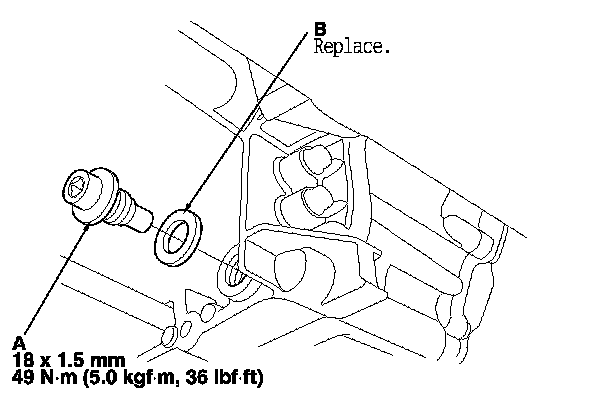 4. Remove the drain plug (A), and drain the ATF. Then reinstall the drain plug with a new sealing washer (B).