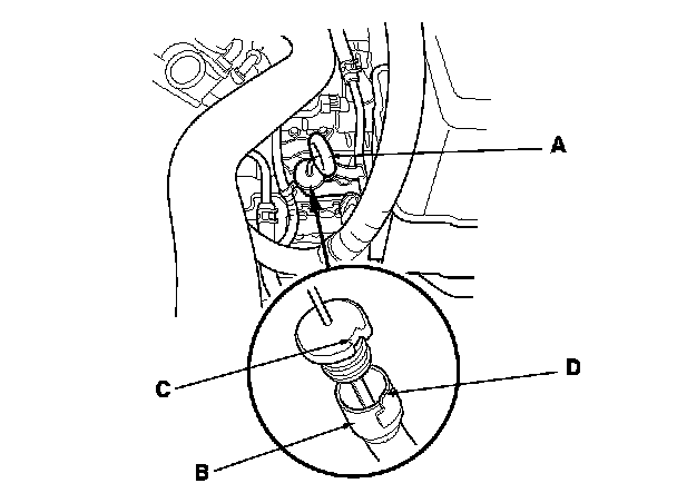 6. Insert the dipstick (A) into the guide tube (B) aligning the notch (C) with the guide tab (D).