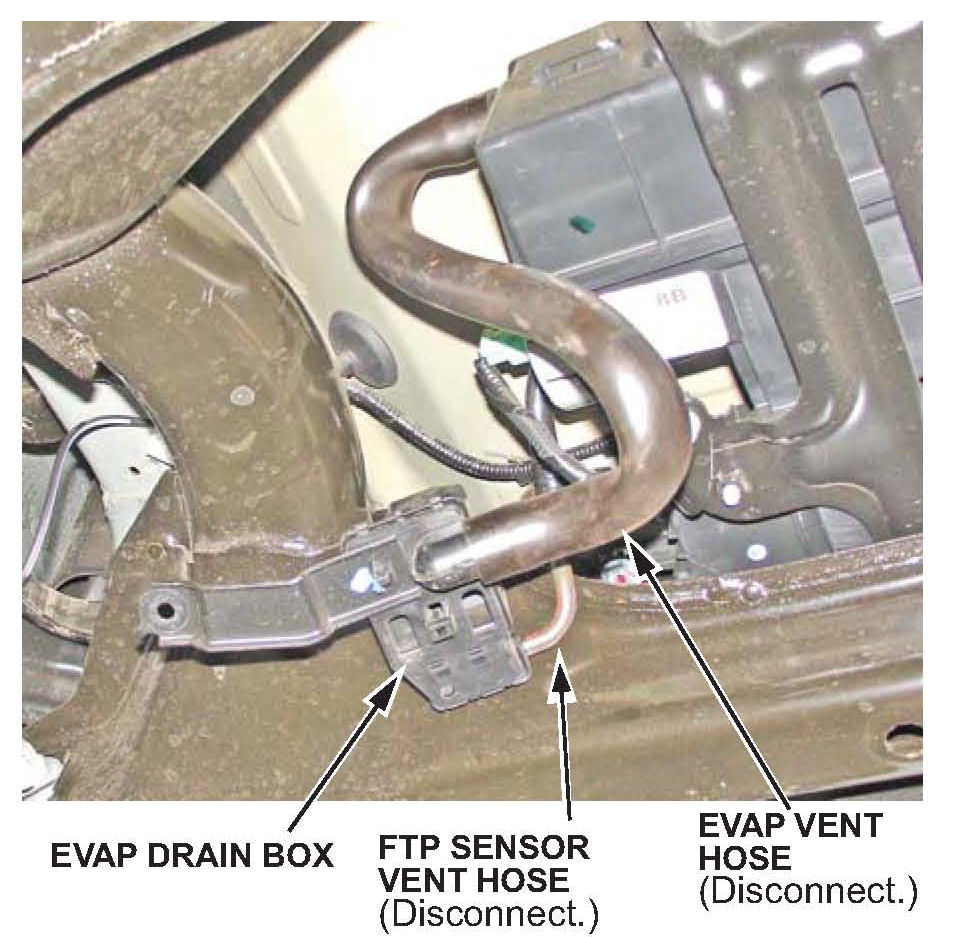 2. Pull down the drain box, then disconnect the fuel tank pressure (FTP) sensor vent hose from the drain box, and disconnect the EVAP vent hose from the EVAP canister.