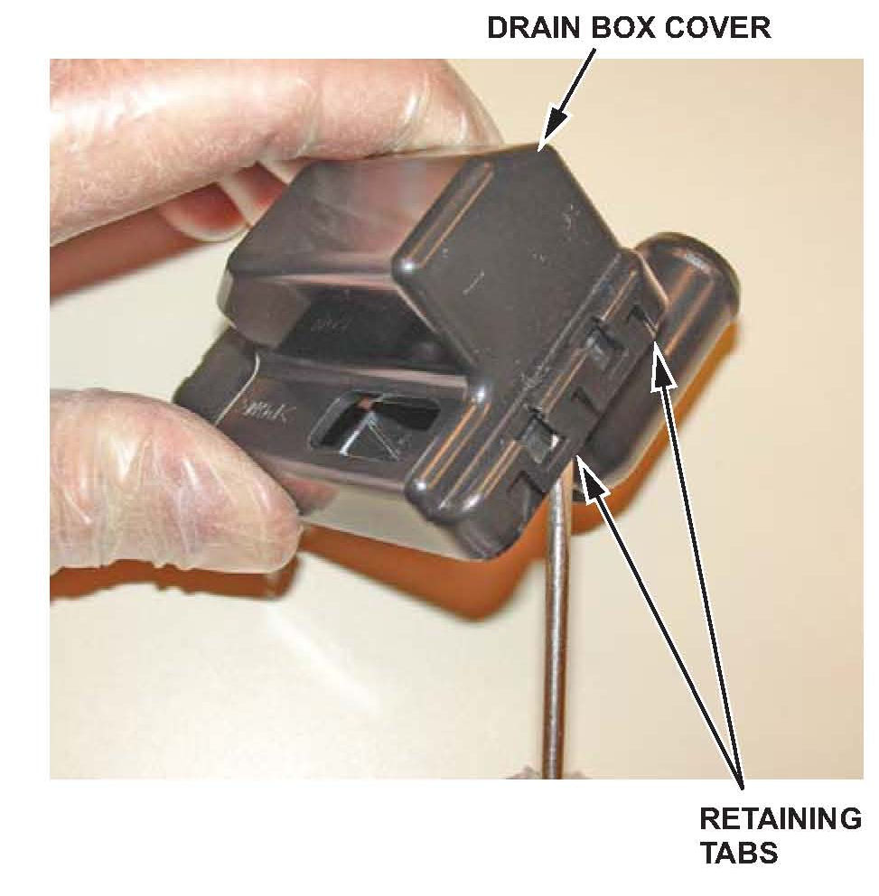If any of the drain box cover retaining tabs are damaged or broken, replace the drain box.