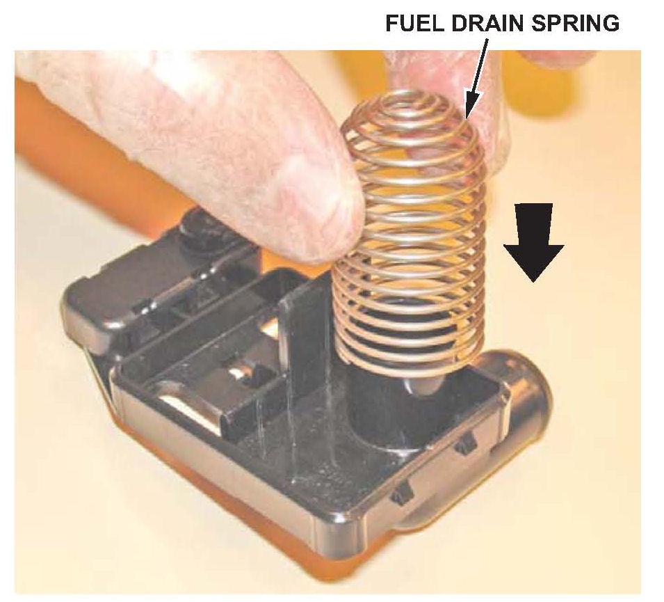 6. Install the fuel drain spring over the EVAP vent hose port in the drain box as shown, then reinstall the drain box cover.