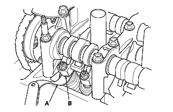 4. Insert the feeler gauge (A) between the adjusting screw (B) and the end of the valve stem, and slide it back and forth; you should feel a slight amount of drag.