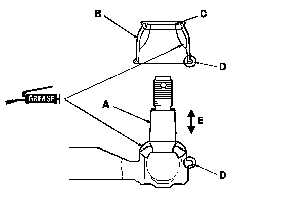 - Keep grease off the boot mounting area (D) and the tapered section (E) of the ball pin.