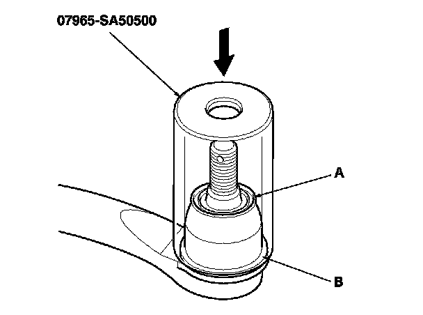 6. Install the ball joint boot (A) using the front hub dis/assembly tool. The boot must not have a gap at the boot installation sections (B). After installing the boot, check the ball pin tapered section for grease contamination, and wipe it if necessary.