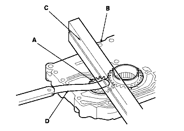 3. Remove the ATF pump driven gear shaft. Measure the thrust clearance between the ATF pump driven gear (A) and the main valve body (B) using a straight edge (C) and a feeler gauge (D).