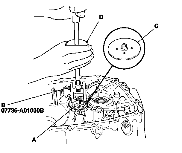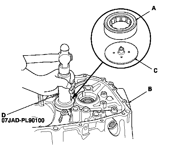2. Remove the needle bearing (A) using the 20-40 mm adjustable bearing puller (B) and a commercially available 3/8''-16 UNF slide hammer (D), then remove oil guide plate C.