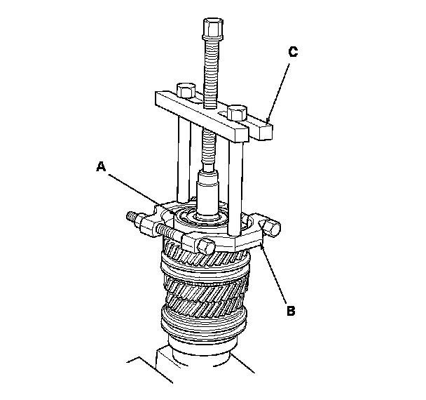 1. Remove the angular ball bearing (A) using a commercially available bearing separator (B) and a commercially available bearing puller (C).