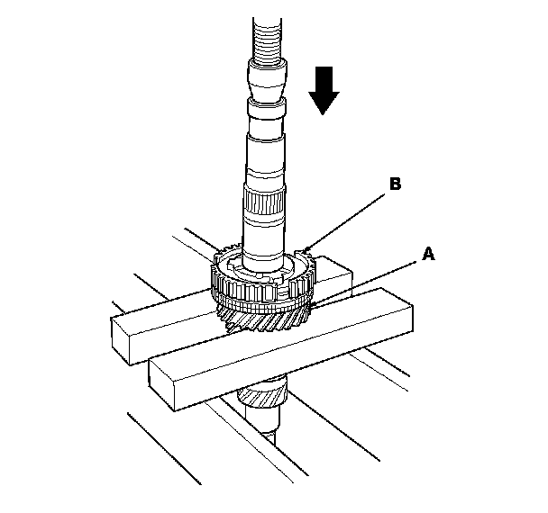 2. Support 5th gear (A) on steel blocks, and press the mainshaft out of the 5th/6th synchro hub (B) and 5th gear.
