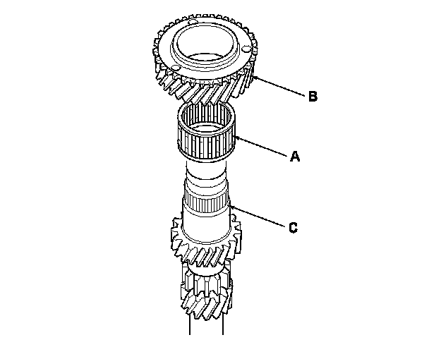 2. Install the needle bearing (A) and 3rd gear (B) onto the mainshaft (C).