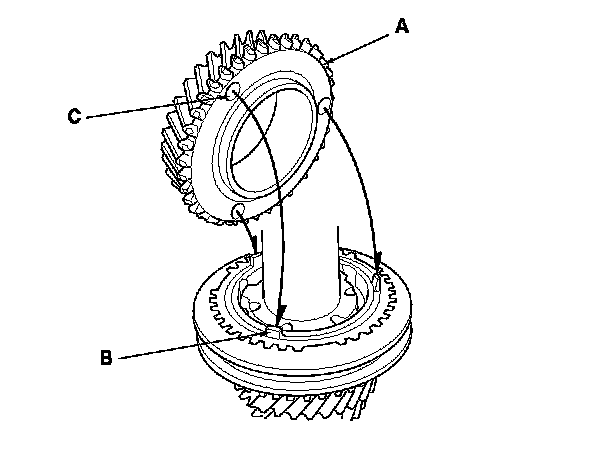 8. Install 4th gear (A) by aligning the synchro cone fingers (B) with the holes (C) in 4th gear.