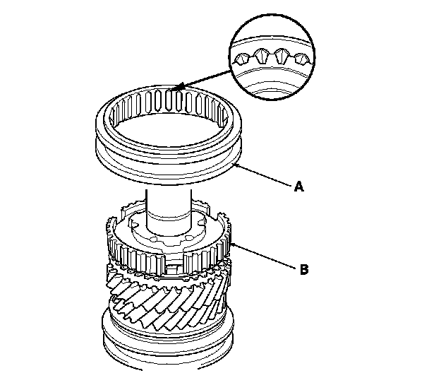 13. Install the 5th/6th synchro sleeve (A) by aligning the slots of the 5th/6th synchro sleeve and the 5th/6th synchro hub (B). After installing, check the operation of the 5th/6th synchro hub set.