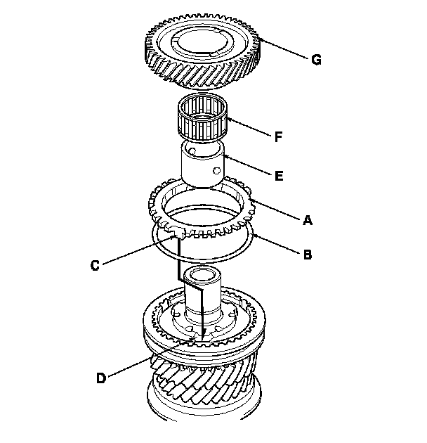 3. Install the double cone synchro assembly (A) with the synchro spring (B) by aligning the synchro cone fingers (C) with the holes (D) in 3rd gear.