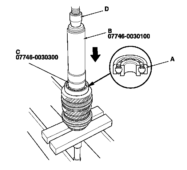 12. Press on the 5th/6th synchro hub (A) using the 40 mm inner driver handle (B), the 30 mm inner bearing driver attachment (C), and a press (D).