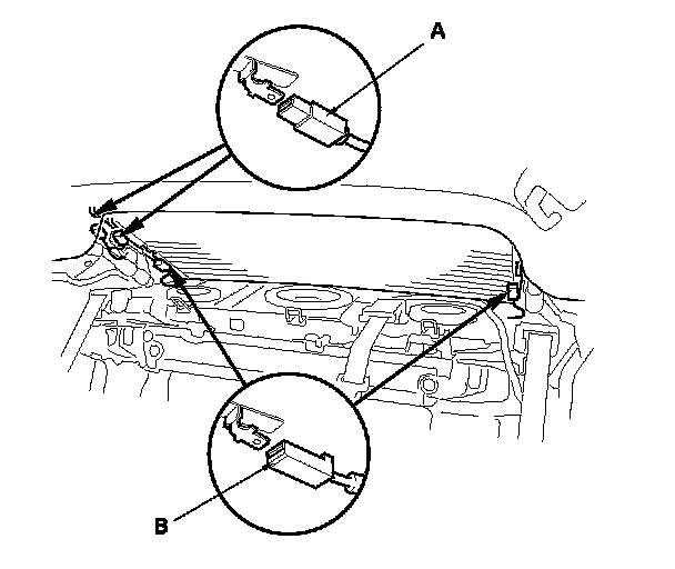 2. Disconnect the window antenna connectors (A) and the rear window defogger connectors (B).