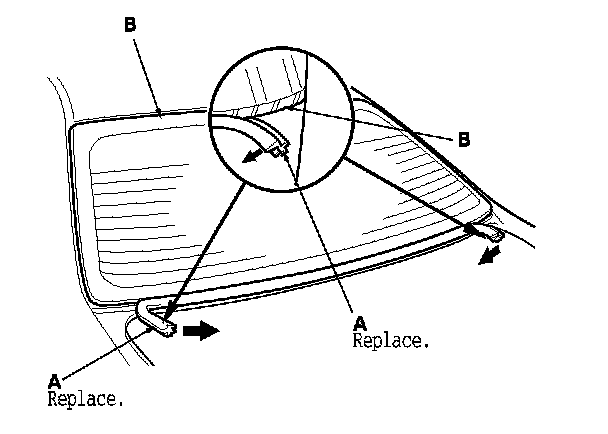 6. Remove the lower rubber dam (A) from the lower edge of the rear window (B). If necessary, cut the rubber dam with a utility knife.