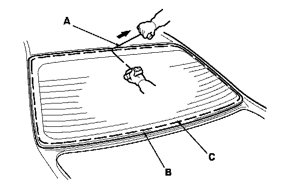7. With a helper on the outside, pull the piano wire (A) back and forth in a sawing motion. Hold the piano wire as close to the rear window (B) as possible to prevent damage to the body, and carefully cut through the adhesive (C) around the entire rear window.