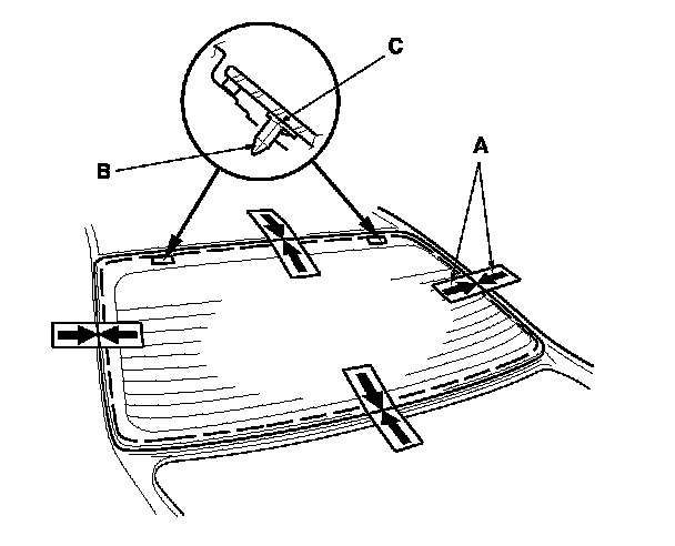 15. If you are installing a new rear window, set the rear window in the opening, and center it. Make alignment marks (A) across the rear window and the body with a grease pencil at the four points shown. Make sure the pins (B) of both upper clips (C) contact with the edge of the body holes. Be careful not to touch the rear window where the adhesive will be applied.